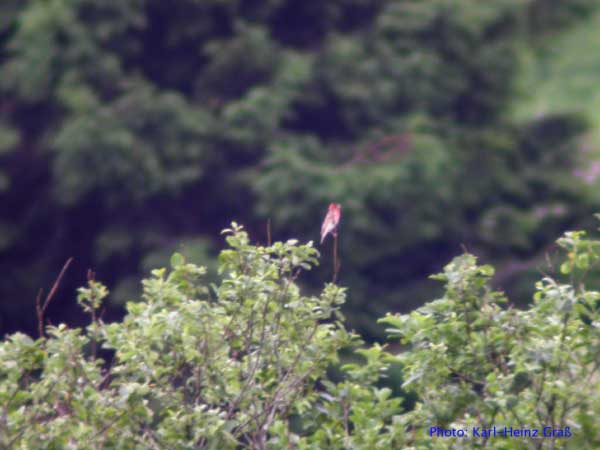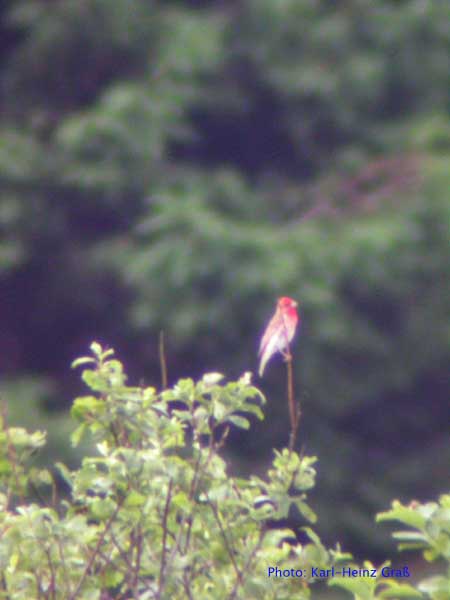 Im Juni kann man den Karmingimpel - einen recht eindrucksvollen Vogel - beobachten. Er ist aber nur recht schwer zu entdecken. Am ehesten kann man ihn hören. Dies ist aber nur kurze Zeit der Fall: Mitte bis Ende Juni eines jeden Jahres.