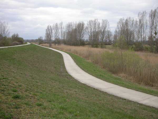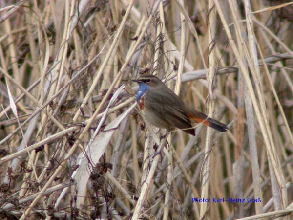 Fährt man von Leeheim, südwestlich von Groß Gerau, in Richtung Erfelden und hält sich kurz vor Ortsende rechts und folgt der Rheinstraße, kommt man zu großen Parabolantennen. Dort kann man recht gut parken und dann auf dem Rheindamm in nördlicher Richtung laufen. Nicht weit vom Parkplatz findet sich östlich des Dammes ein kleines Schilfgebiet, in dem sich ab April Blaukehlchen tummeln. Diese kann man vom Damm aus ganz hervorragend beobachten. Häufig suchen sie am Boden am Rande des Radweges der am Damm entlang führt nach Nahrung und sind so dem Beobachter recht nah.