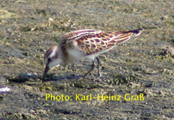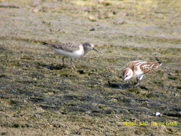 juvenile Zwergstrandläufer (zu erkennen am hellen V auf dem Rücken)