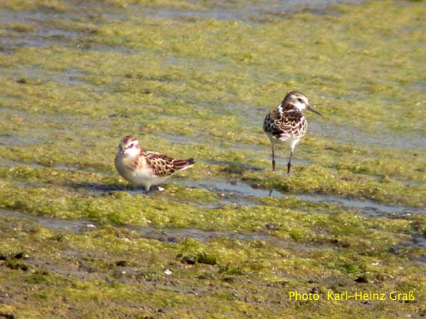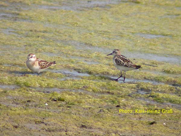 Sichelstrandläufer und Alpenstrandläufer (rechts)