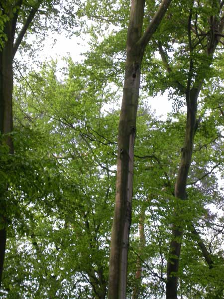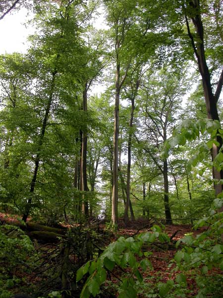 Hier in diesem offenen Buchenbestand war die Bruthöhle. Schwarzspechte zimmern übrigens in jedem Jahr eine neue Höhle. Die alten verlassenen dienen dann anderen Vögeln (z.B. Hohltauben, die es übrigens auch dort zu finden gibt) als Brutplatz.