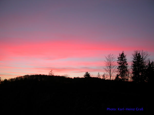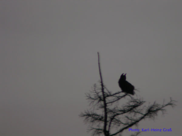 In der Nähe des Diemelsees rufen die Uhus wieder. Erst sahen wir ein tolles Abendrot bei eisiger Kälte. Dann fing um 17:35 der männliche Uhu - auf einer hohen Fichte sitzend - an zu rufen. Leider war er recht weit entfernt, sodass nur zwei Bilder einigermaßen gelangen. Bald antwortete auch das Weibchen. Es ist zu hoffen, dass sie eine erfolgreiche Brut haben werden.