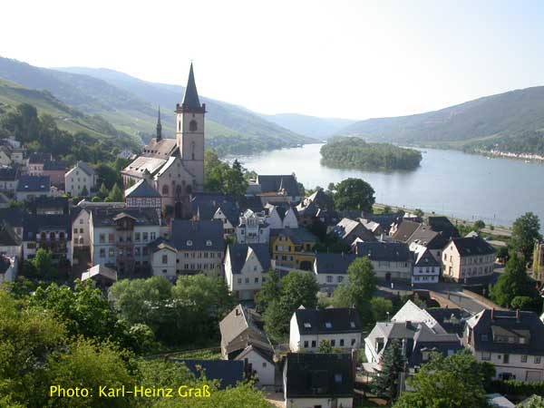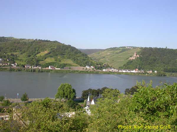 im Vordergrund: Lorchhausen und auf der gegenüberliegenden Seite im Hintergrund: Bacharach