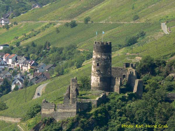 Die gegenüber liegende Rheinseite mit der Burgruine Fürstenberg