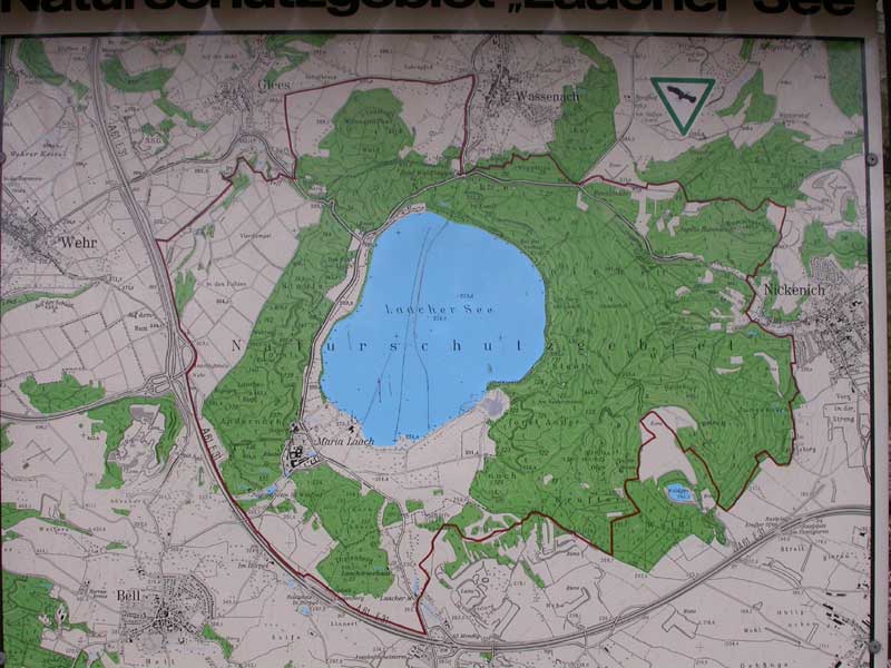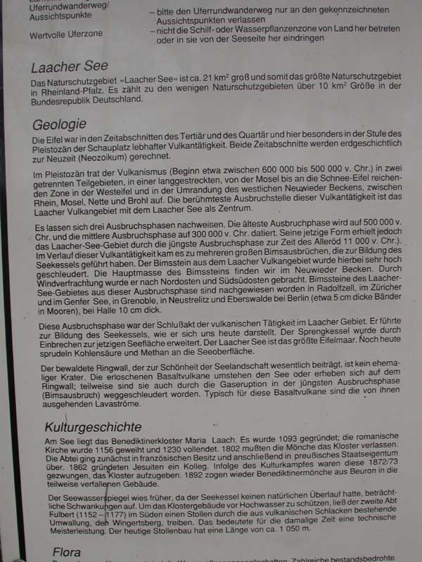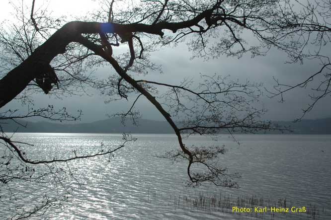 Der See ist ein Einbruchsbecken (Caldera) und hat einen Umfang von gut 7 km mit einer Fläche von 3,3 qkm. Er wird gespeist durch Niederschlagswasser und hat eine Tiefe von bis zu 53 m. Man kann den See umrunden, hat aber nur an manchen Stellen guten Einblick. Meistens ist zwischen Uferweg und See eine Vegetationszone. Hier im Nordosten - gegenüber dem Kloster - sind ein paar Stellen, wo man den See gut überblicken kann.