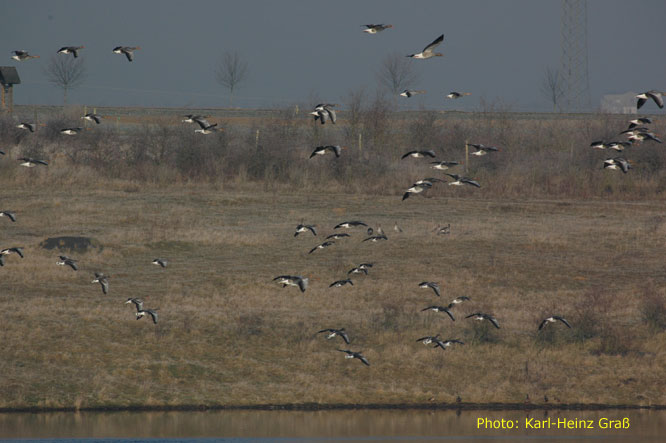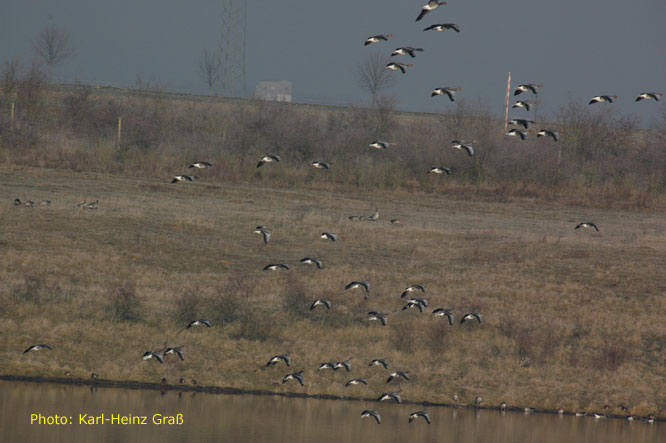 Zur Zeit sind viele Gänse (Grau- und Bläßgänse) am Pfaffensee zu finden.