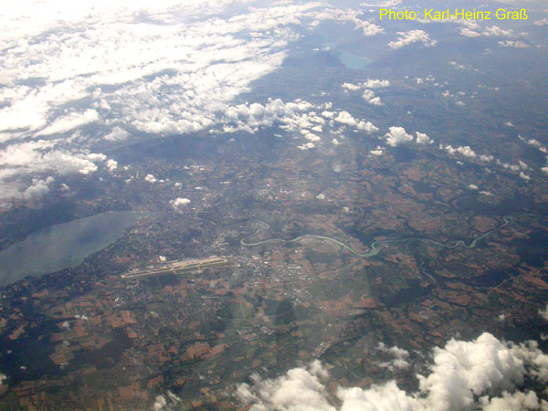 Anfangs herrschte dichte Bewölkung, die erst über der Schweiz aufriss. Auf dem obigen Foto ist Genf, der westliche teil des Genfer Sees, die Rhone und im oberen Teil der Lac d`Annecy zu sehen. Der Flug ging weiter über Lyon, das Massif  Central, etwas nördlich der französischen Pyrenäen und weiter nach Spanien, etwas südlich von Biarritz (zu sehen war die französische Atlantikküste). Weiter ging es dann in südwestlicher Richtung nach Spanien, .......