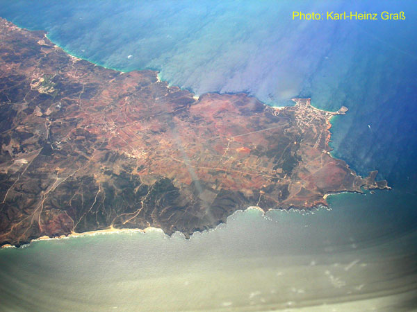 Hier der südwestlichste Zipfel Portugals: Unten ganz rechts das Cabo de Sao Vicente und darüber der Ort Sagres und die Ponta de Sagres.