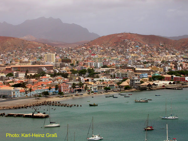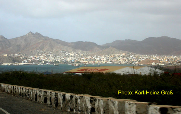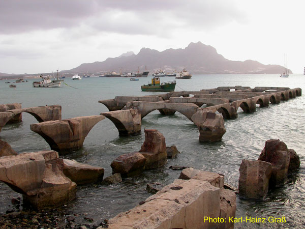 .....eine alte Hafenbrücke und die Bucht von Mindelo (Porto Grande). Die  im Hintergrund  zu sehenden Berge sind knapp 500 m hoch.