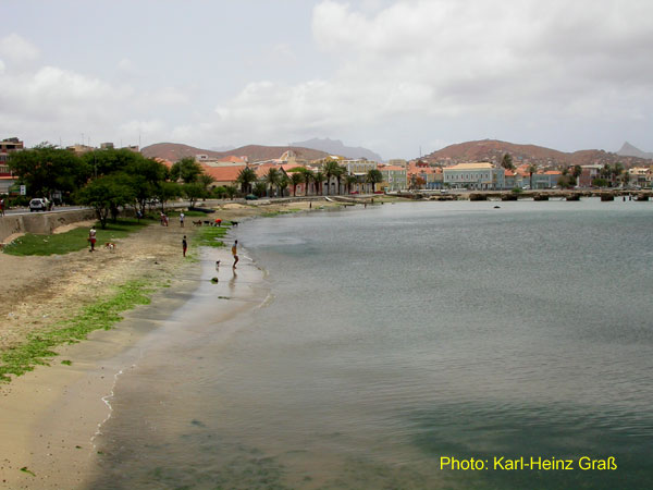Nachdem wir die Sachen ins Hotel gebracht haben sind wir erst einmal in die Stadt. Da Sonntag war, war absolut alles verrammelt und verriegelt. Wie ausgestorben. Nur am Strand tummelten sich ein paar Menschen. Abends war dann allerdings in dem Park: "Praca Amilcar Cabral" die Hölle los. Man hatte den Eindruck, halb Mindelo trifft sich in diesem kleinen Park.