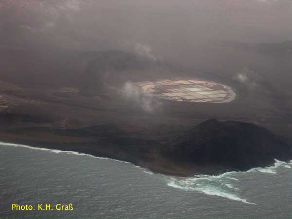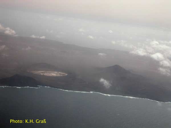 Hier - das Foto ist auf dem Hinflug entstanden - kann man die Saline in dem Krater sehr schön sehen. Der Kraterboden liegt unterhalb des Meeresspiegels, wodurch Meerwasser einsickert und verdunstet. Zurück bleibt das Salz.