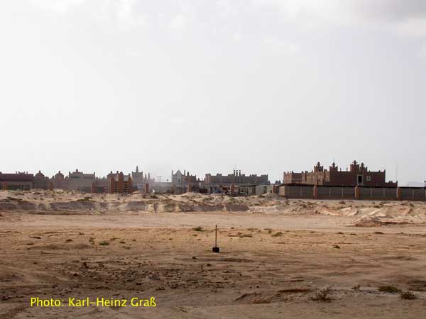 In der Bildmitte vor dem rechten Strand sieht man etliche große Hotelanlagen liegen, die bereits bestehen. Im Vordergrund, die riesige Hotelanlage befindet sich noch im Bau (nächstes Bild) und ein großer Teil des anschließenden Strandes nach links, auch über das Bild hinausgehend ist bereits für weiter große Hotelanlagen verplant. Ein Problem dabei ist, dass dieser Weststrand ein wichtiges Gebiet ist, in dem Meeresschildkröten ihre Eier ablegen, und welches dadurch sicher zerstört werden wird.