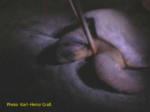 Nach einer Weile wurde der Biologe über Walky Talky darüber informiert, dass eine Schildkröte entdeckt worden war (mehrere Helfer laufen den Strand ab und melden jede Schildkröte). Wir wurden dann mit Jeeps dorthin gebracht und konnten noch die letzten paar Eier, die das Tier legte in`s Loch plumpsen sehen. Der Biologe leuchtete mit einer winzigen Taschenlampe so eben gerade das Loch aus. Die Schildkröte bemerkte dies nicht. Anschließend grub sie das Loch wieder zu mit Sand und wollte wieder zum Wasser. Dann kam der Einsatz unserer Biologen und deren Helfer. Das Tier wurde ausgiebig vermessen, bekam einen Chip implantiert und eine gewebeprobe bzw. etwas Blut entnommen. Das alles ging sehr schnell. Natürlich gibt es in einer Beobachtungsgruppe (wir waren ca. 30 - 40 Leute) immer 1 - 2 Deppen, die dann doch blitzen müssen. Ich habe auf Blitz verzichtet, daher sind die Aufnahmen nur sehr dürftig geworden. Ich finde aber, sie entsprechen sehr schön der Stimmung und sind deshalb ganz passend!