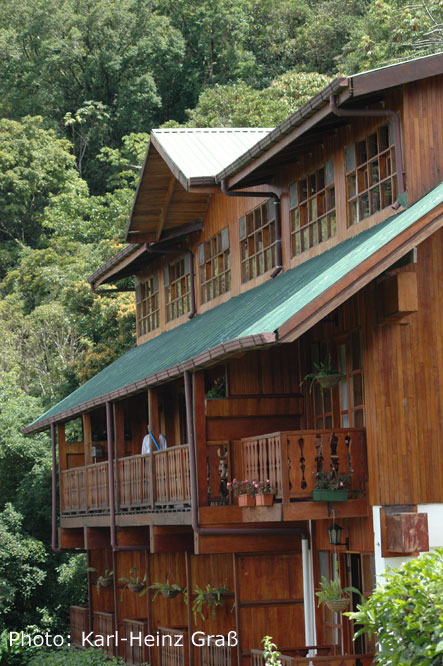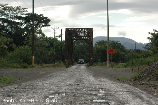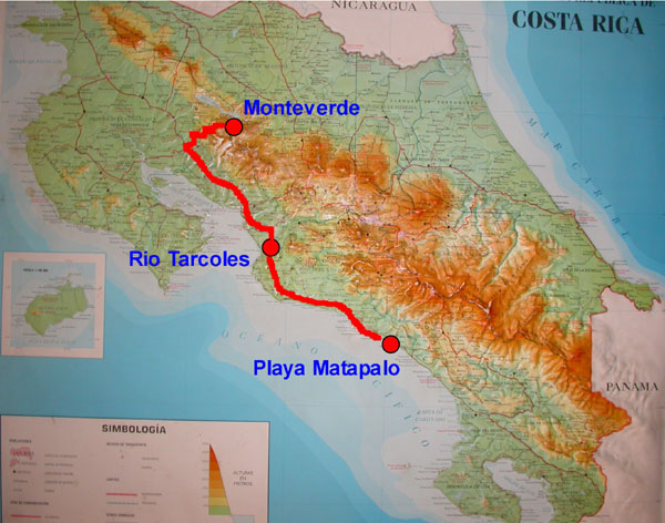 Bei Las Juntas verließen wir die Panamericana (auf die wir bei Barranca aufgefahren waren) um nach Monteverde zu gelangen. Die ersten 10 km waren neu asphaltiert und der Gedanke überkam uns, dass vielleicht die gesamte Strecke so sein könnte. Aber: Zu früh gefreut. Satte 20 km Piste kamen doch noch auf uns zu. Und zwar eine Piste vom Allerfeinsten. Es ging nämlich in die Berge, d.h. man muss auf eine Höhe von etwa 1500 m. Und es geht teilweise recht steil bergauf bis nach Santa Elena. Aber zum Glück regnete es nicht (was dort im Nebelwaldgebiet eher die Regel ais die Ausnahme ist). Und man glaubt es kaum: Dicke Busse quälen sich dort hinauf. Monteverde ist nämlich eines der touristischen Highlights in Costa Rica.