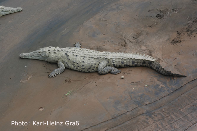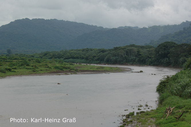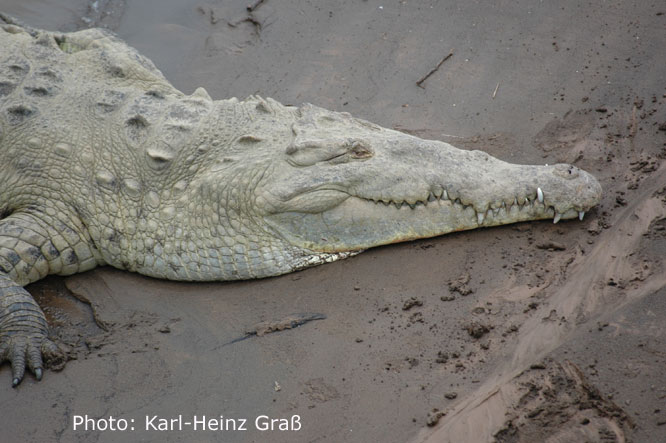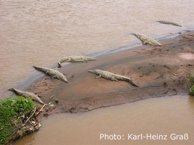 Dies ist der Rio Tarcoles zwischen Quepos und Puntarenas. Der Fluss wird von einer hohen Brücke überspannt, von der aus man gefahrlos die auf einer Sandbank im Fluss in stattlicher Zahl liegenden Krokodile bestaunen kann.