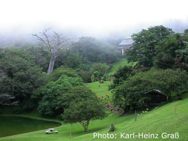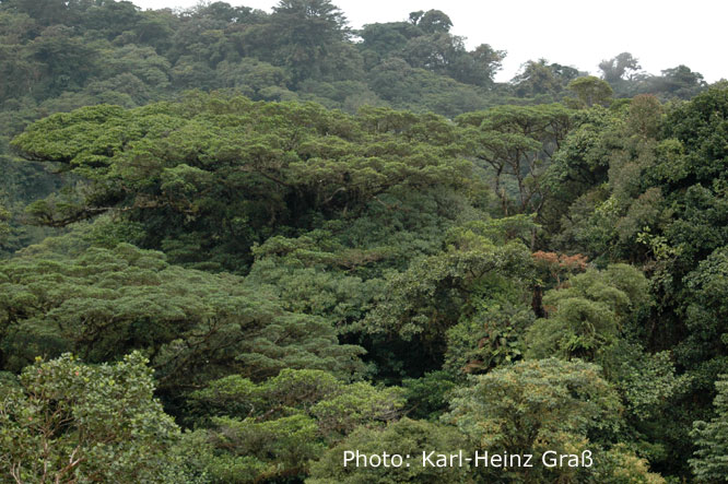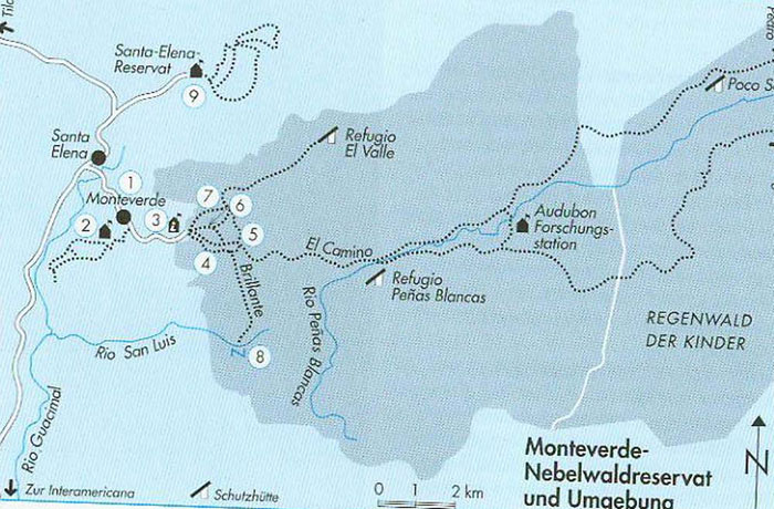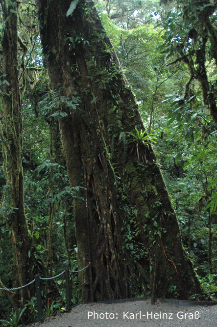 Das Monteverde - Nebelwaldreservat wurde 1972 von zwei amerikanischen Wissenschaftlern und einem Quäker gegründet. Heute umfasst es ca. 10500 ha Fläche und liegt genau auf der kontinentalen Wasserscheide. Etwa 2500 Pflanzenarten, 100 Arten von Säugern sowie 400 Vogelarten kommen dort vor. Letztere haben wir leider nicht alle gesehen.....