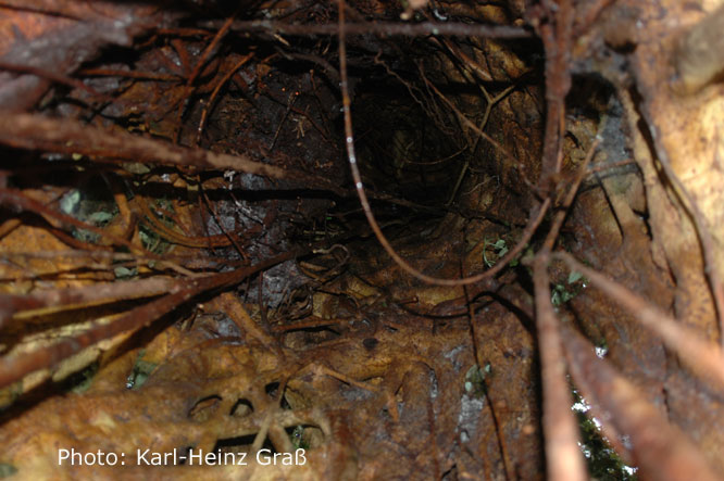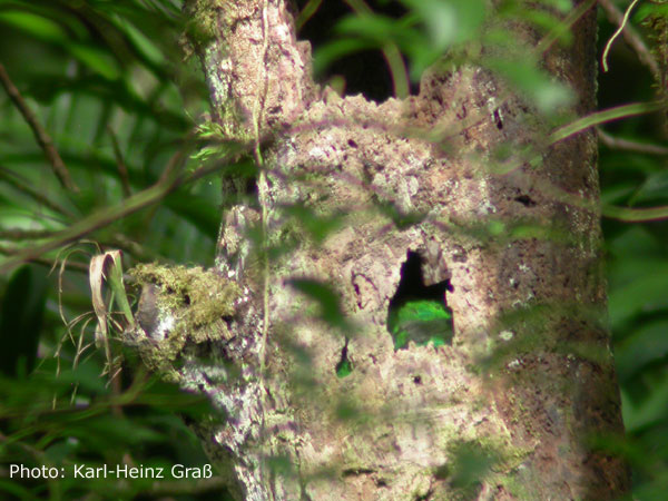 Am Parkausgang gab es dann aber noch ein Special: Unweit des Weges konnte man eine Baumhöhle erkennen, in der es grün schillerte. Hier brütete ein Quetzal. Eigentlich hätte man sich ja entsprechend auf die Lauer legen müssen, weil der Vogel ja auch mal rauskommt. Aber da es ja noch andere interessante Dinge gibt........