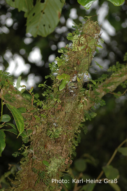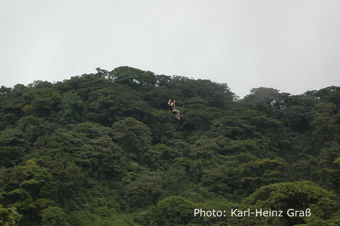 Philipp hatte noch eine andere Attraktion im Blick: "Canopy". Dabei läuft man auf einem Rundweg zu Plattformen, zwischen denen Stahlseile gespannt sind. An diese hängt man sich ein und gleitet so über den Nebelwald hinweg. War mir zu schnell um noch was Interessantes beobachten zu können. Dafür flog aber etwas auf kurze Distanz an Philipp vorüber: