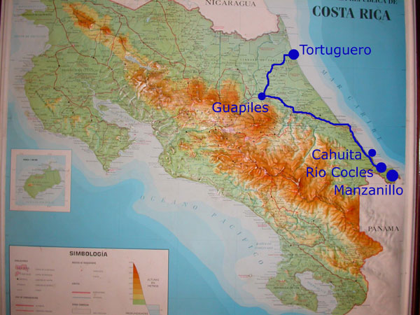 Zunächst ging es wieder zurück nach Guapiles und von dort weiter in Richtung Limon. Anschließend an der Küste entlang gen Süden. Für die insgesamt ca. 200 km benötigten wir incl. Bootstransfer und Frühstück zwischendurch ca. 8 Stunden!