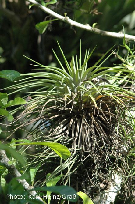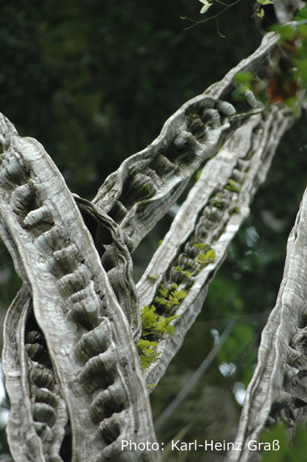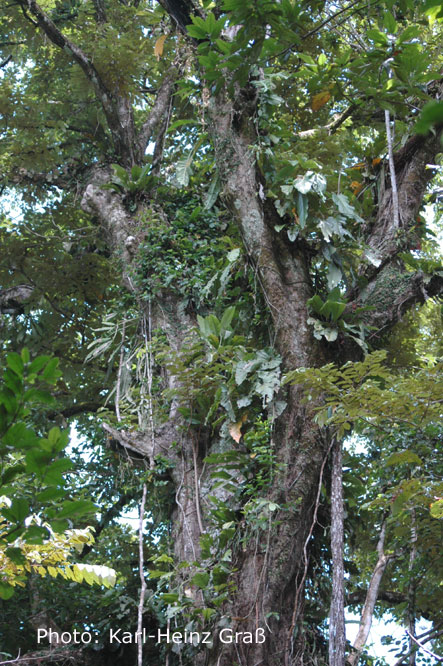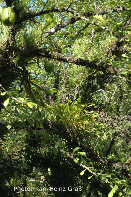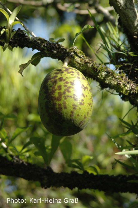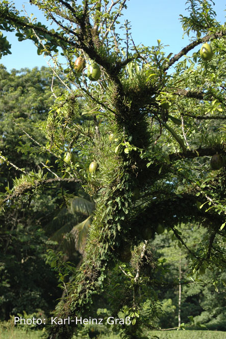 Kalebassen - Baum (Cujete sp. bzw. Cresentia cujete) aus der Familie der Bignoniaceae mit Früchten und Epiphyten.