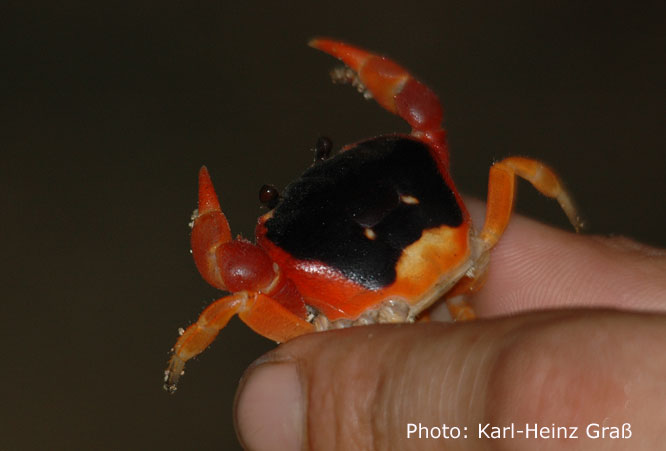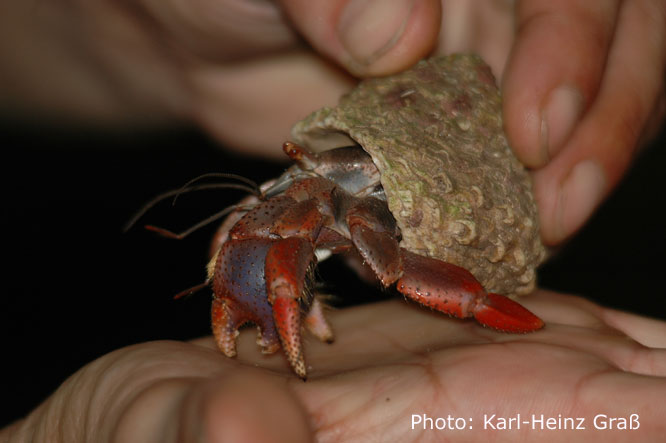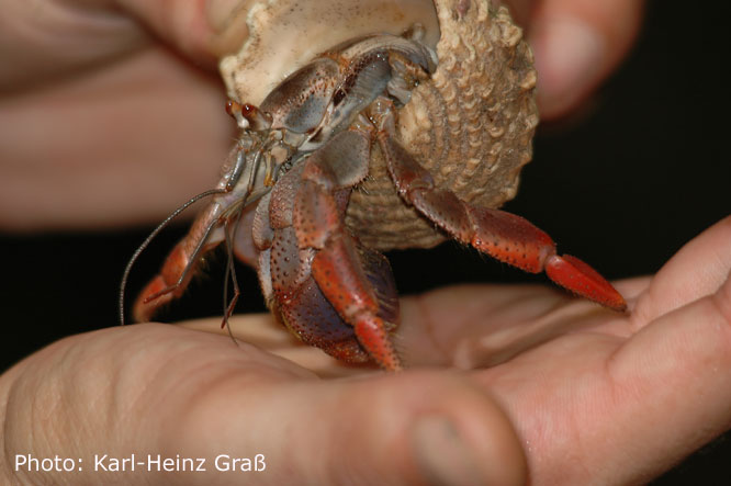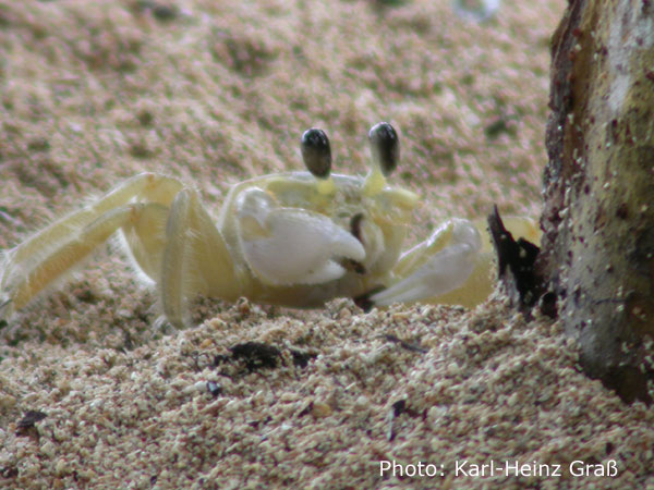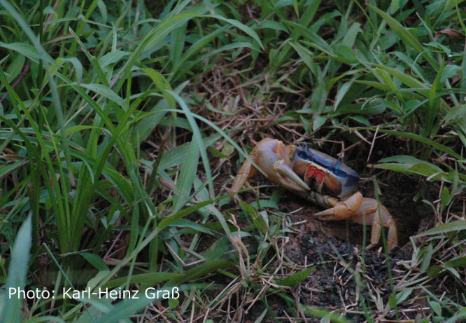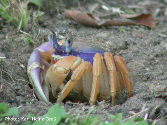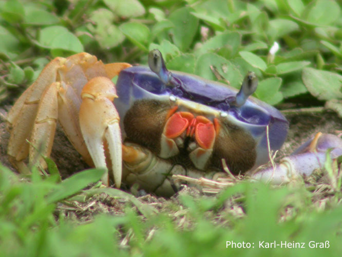 Blaue Landkrabbe - die Tiere sind sehr scheu. sobald sie die geringste Bodenvibration spüren, sind sie bklitzartig in ihren Erdlöchern verschwunden. So war das Fotografieren, selbst durch´s Spektiv (also mit gebührendem Abstand) nicht leicht.