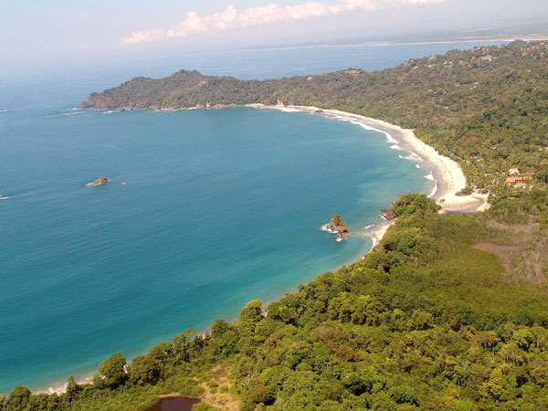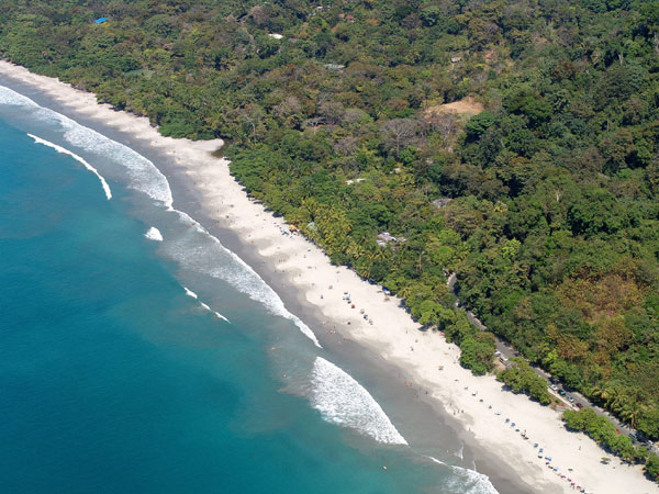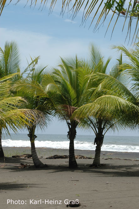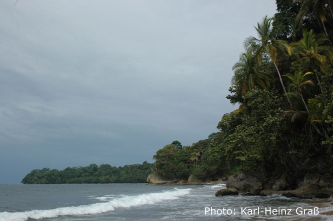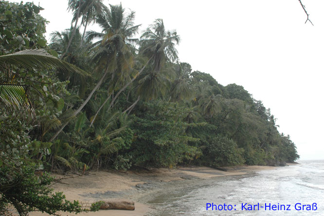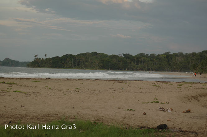 Der Strand von Rio Cocles - in der rechten Bildhälfte mündet der Wasserlauf, weshalb hier oft Wasservögel anzutreffen sind: