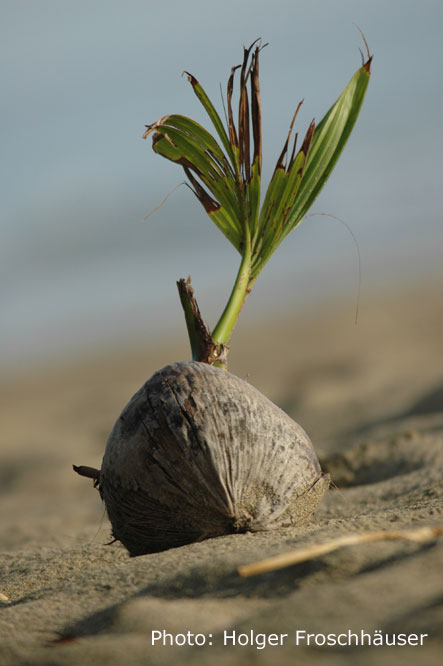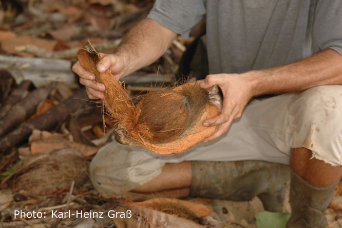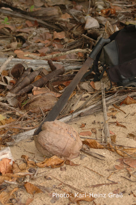 Am Strand macht uns Gyula noch eine Kokusnuss auf - sie schmeckt köstlich! - Überall liegen diese Nüsse herum. Man muss es aber verstehen, sie aufzuschlagen, ohne sich dabei die Finger abzuschlagen....