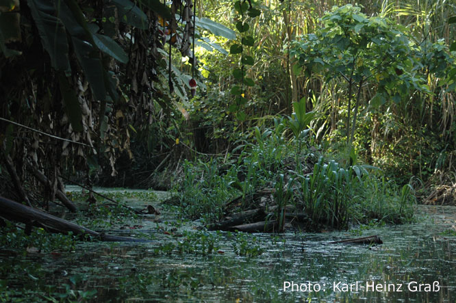 Am Sonntag, 05. 08. 07 bin ich morgens zum Refugio Aviarios del Caribe (einem privaten NSG) - nördlich von Cahuita - gefahren. Dort mündet zum einen der Rio Estrella ins Meer und zum anderen kann man sehr viel über Faultiere erfahren, da der Besitzer eine Auffangstation für kranke, verletzte oder verwaiste Faultiere geschaffen hat. Schön ist die Fahrt in einem "Staksekahn" über die kleinen Kanäle um die Station. Zum Rio Estrella - wie im Reiseführer Natur beschrieben - kommt man allerdings nicht mehr, da die Kanäle inzwischen Sackgassen sind aufgrund umgestürzter Bäume, dichten Bewuchs etc. Wenn man also dorthin will, sollte man zunächst früh morgens an der Station vorbeifahren und gleich anschließend nach rechts abbiegen um zur Mündung und der seichten Lagune des Rio Estrella zu gelangen, da man natürlich um die Uhrzeit die besten Beobachtungsmöglichkeiten hat. Ich wusste dies leider nicht und kam so erst gegen Mittag zur Lagune, als zum einen die Sonne ziemlich flirrte und zum anderen kaum noch Vögel dort waren. Aber C´est la vie! Dafür hatte ich andere interessante Erlebnisse: