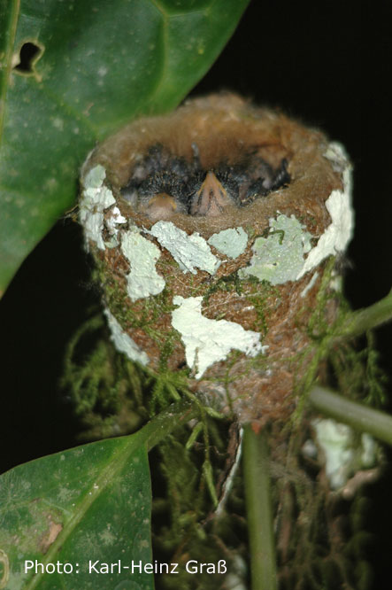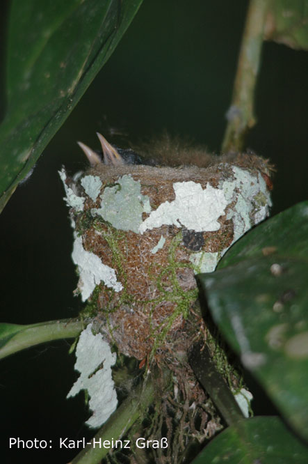 Dann etwas ganz schönes: Ein winziges Nest mit zwei jungen Kolibris. Leider weiß ich nicht, welche Art. Ich hab noch ne Weile in gebührendem Abstand mit aufgebautem Spektiv gewartet, ob ein Altvogel kommt, hatte aber kein Glück diesbezüglich.