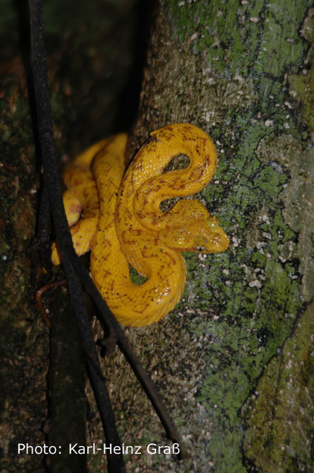 Auch hier entdeckten wir wieder eine (Gelbe) Lanzenotter (Eyelash Palm Pitviper) (Bothriechis schlegelii)