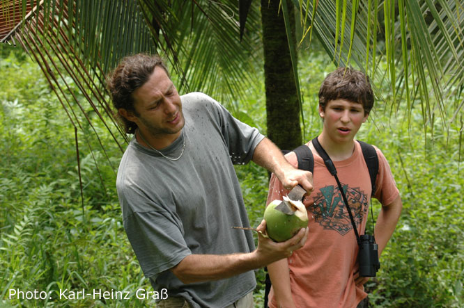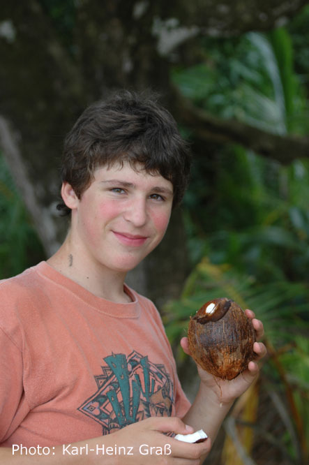 Hier probieren wir den Saft einer Kokosnuss - köstlich!