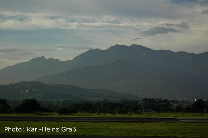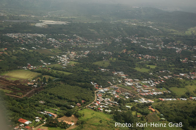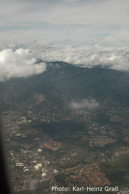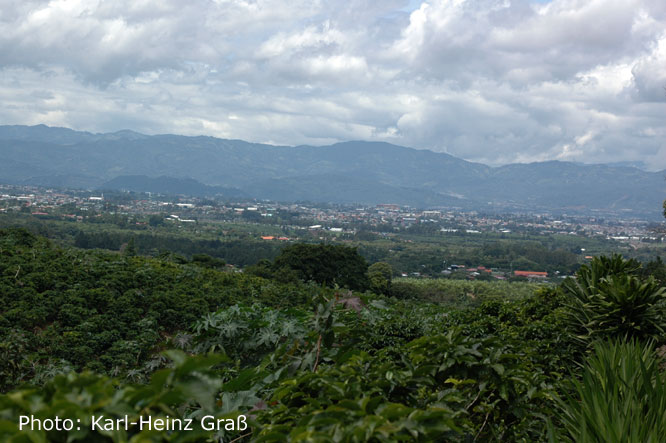 Wir vermieden es wie bei der Hinfahrt durch San Jose zu fahren, da dies doch viel Zeit gekostet hätte. Hier aber einen Blick auf die Lage der Stadt. Im Vordergrund übrigens: Kaffeeanbau!