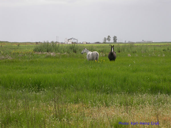 auch hier, wie schon in den Marismas Valverde, immer wiedergrüne Wiesen mit Pferden.