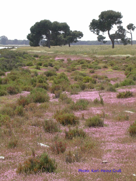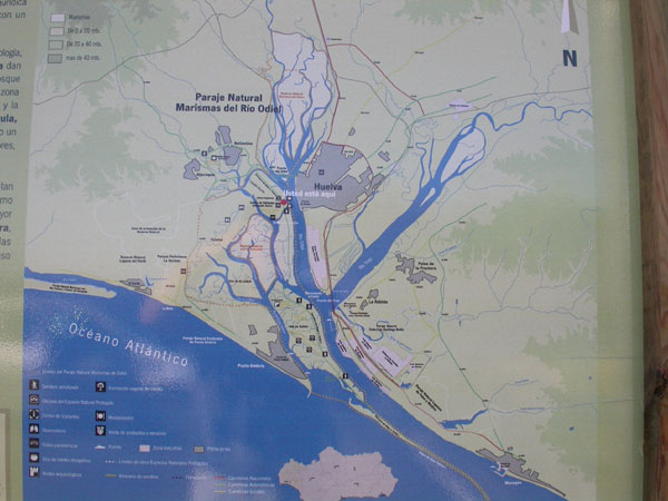 Bei Huelva liegt noch ein weiterer "Hotspot" - die Marismas del Odiel. Von Norden kommend fließt der Odiel südlich von Huelva mit dem Rio Tinto, der von Nordosten kommt, zusammen. Gemeinsam münden sie dort ins Meer. Dort kommt es zu einem großflächigem Überschwemmungsgebiet im Übergangsbereich von Süß- und Salzwasser.