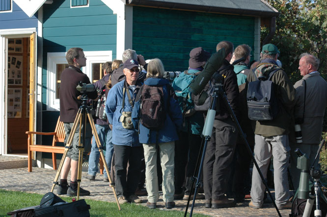 .....dementsprechend herrschte großer Andrang seitens der noch anwesenden Teilnehmer der in der Vorwoche stattgefundenen "Helgoländer Vogeltage". Diese sind alljährlich im Oktober und locken eine Vielzahl von Ornis aus Deutschland und den angrenzenden Ländern an. Das hat den Vorteil, dass zu dieser Zeit die Insel ständig "abgescannt" wird und so "Besonderheiten" kaum unentdeckt bleiben.