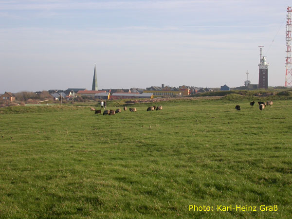 Blick in Richtung Süden auf Kirchturm und Leuchtturm - und kaum im Gras zu erkennen: