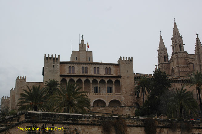 Gegenüber der Kathedrale steht der gotische Palacio de la Almudaina, der über einer der einstigen Residenz der Wesire erbaut wurde, nachdem die Mauren - die ab 903 über die Insel herrschten - im Jahr 1229 von Jaume I vertrieben wurden. Heute ist er zum Teil museal eingerichtet, teilweise ist er Sitz des Militärs. Außerdem dient er dem spanischen König zu Repräsentationszwecken.
