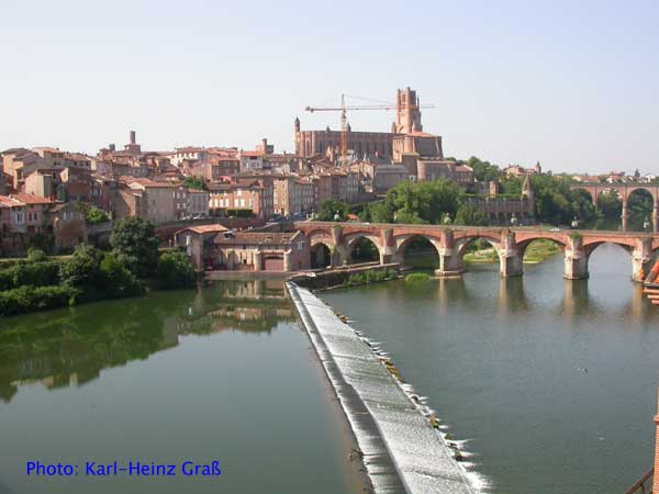 Blick von der Pont du 22. Aout 1944 auf den Tarn, die Pont Vieux aus dem 11. Jh. und die Kathedrale aus dem 13. - 15. Jh. inmitten der malerischen Altstadt. Zwischen Kathedrale und Fluss liegt das Palais de la Berbie, einem ehemaligen Bischofspalast, in dem heute das Museum de Toulouse - Lautrec untergebracht ist.