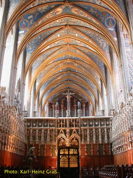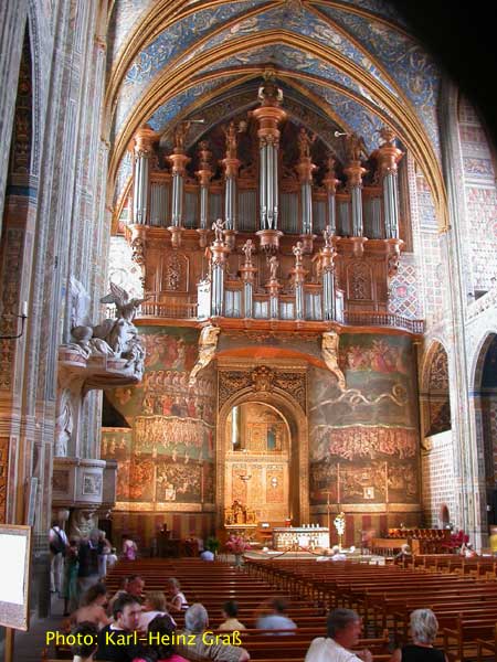 Das Innere der Kathedrale trennt der um 1500 erbaute, größte steinerne Lettner den Chorraum ab, dessen Inneres hier links oben zu sehen ist. Auf dem rechten Bild, unterhalb der Orgel ist das Jüngste Gericht aufgemalt. Das riesige Gemälde stammt aus dem Ende des 15. Jh.