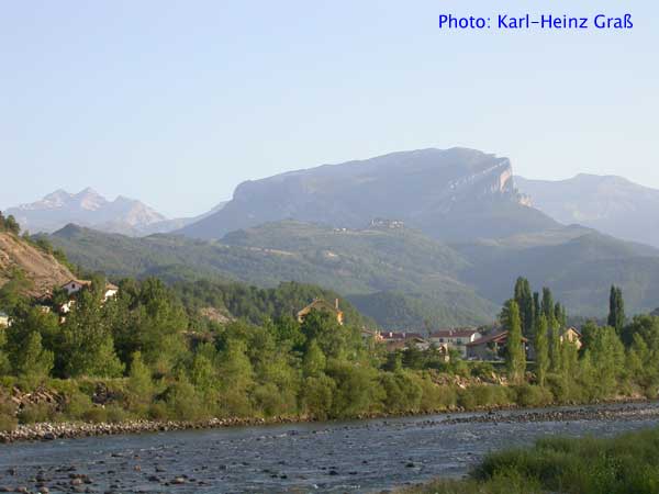 Hier ein Blick von Puertolas in Richtung Süden auf den Riu Cinca, den Ort Laspuna - der östlich oberhalb von Escalona liegt und die 2291 m hohe Pena Montanesa.