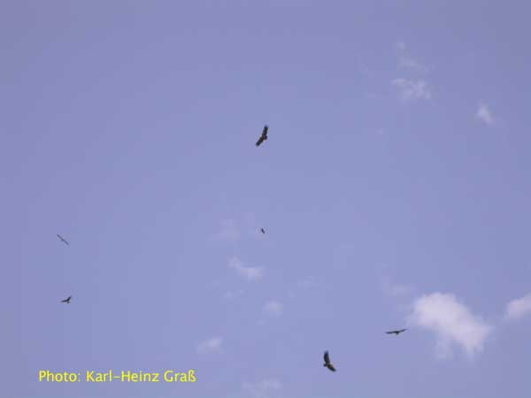 ...dann: etwa 50 Schmutzgeier in den Bäumen und darüber kreisend.