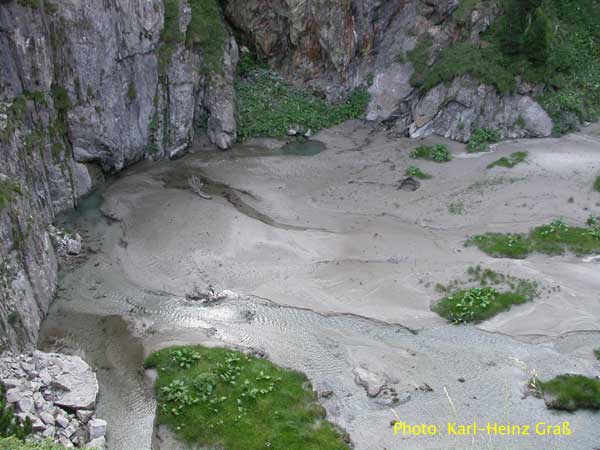 ...kurz zuvor ein beeindruckendes Naturschauspiel. Das ganze Wasser sammelt sich hier in einem Kessel , dem Forau de Aiguallut, und wird unterirdisch abgeleitet.