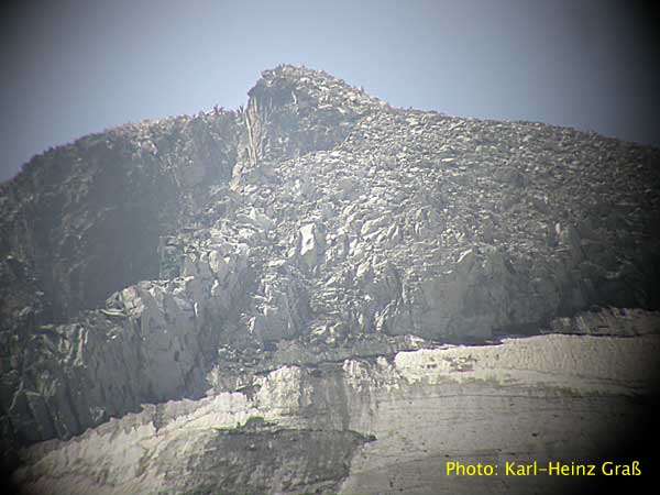 ...der Gipfel im Spektiv. Links davon sind Bergsteiger zu sehen.