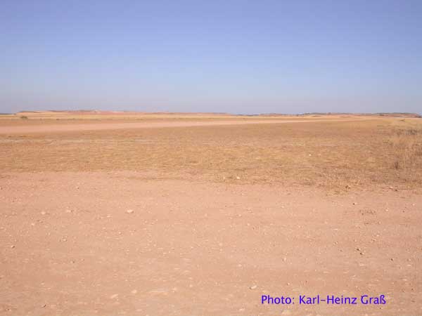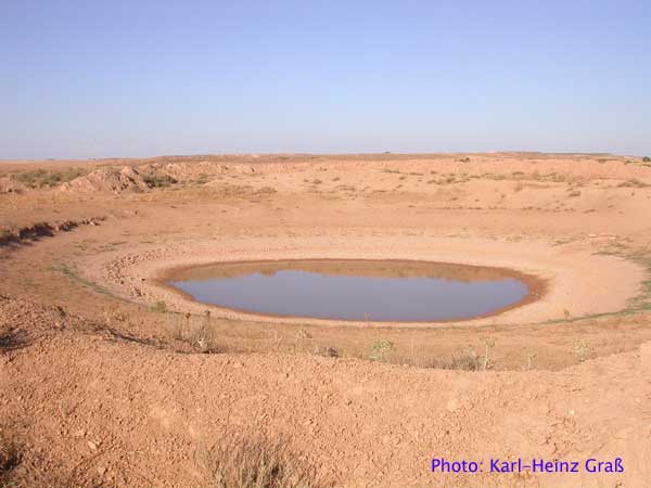 ...nur ganz wenige Wasserlöcher sind noch zu finden. Fast sind auch diese schon ausgetrocknet. Am nächsten Morgen war ich schon vor Sonnenaufgang dort, um Flughühner zu sehen - wahrscheinlich hab ich aber nicht lange genug gewartet, da ich später erzählt bekam, dass Flughühner nicht gleich nach Sonnenaufgang an ihren Wasserstellen erscheinen. Beim nächsten Mal werde ich länger warten!