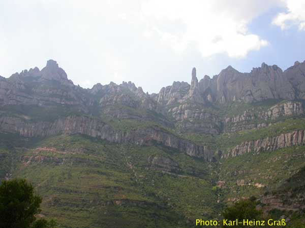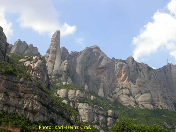 Auf dem Rückweg hab ich noch einen kleinen Abstecher zum Montserrat (zersägter Berg) gemacht. Dieses westlich von Barcelona liegende, 10 km lange und 5 km breite Kalksteinmassiv türmt sich bis zu 1235 m hoch auf. Inmitten der bizarren Felsen, ganz versteckt, liegt das ehemalige, im 9. Jh. gegründete Benediktinerkloster Santa Maria de Montserrat auf 725 m Höhe. heute ist der ursprünglich versteckte Ort der nach der Alhambra in Granada zweitgrößte touristische Anziehungspunkt Spaniens.