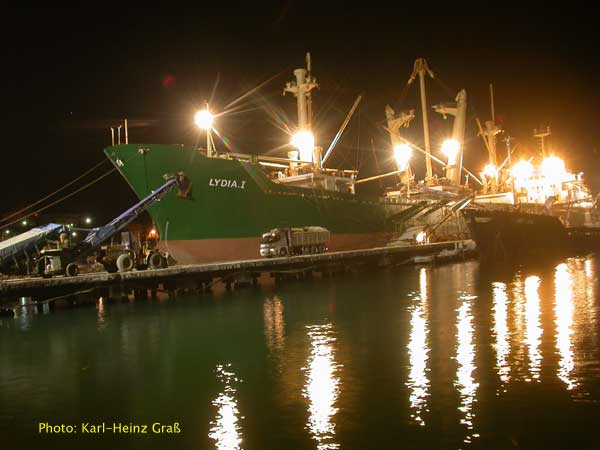 Im Hafen liegen immer zwei Schiffe, die Tag und Nacht beladen werden mit Bauxit, was in der Nähe abgebaut und gemahlen wird. Bis die Schiffe voll sind dauert es ca. eine knappe Woche.